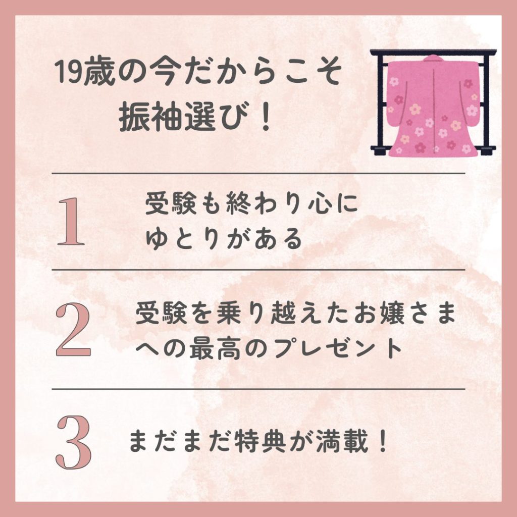 今回は、19歳になって振袖選びを始めた時のメリットと、当店でしか手に入らない豪華な特典について、余すところなくお伝えします。